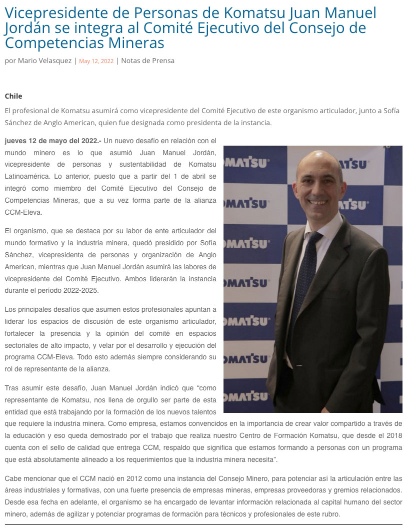 Vicepresidente de Personas de Komatsu Juan Manuel Jordán se integra al Comité Ejecutivo del Consejo de Competencias Mineras - (mvcomunicaciones.cl)