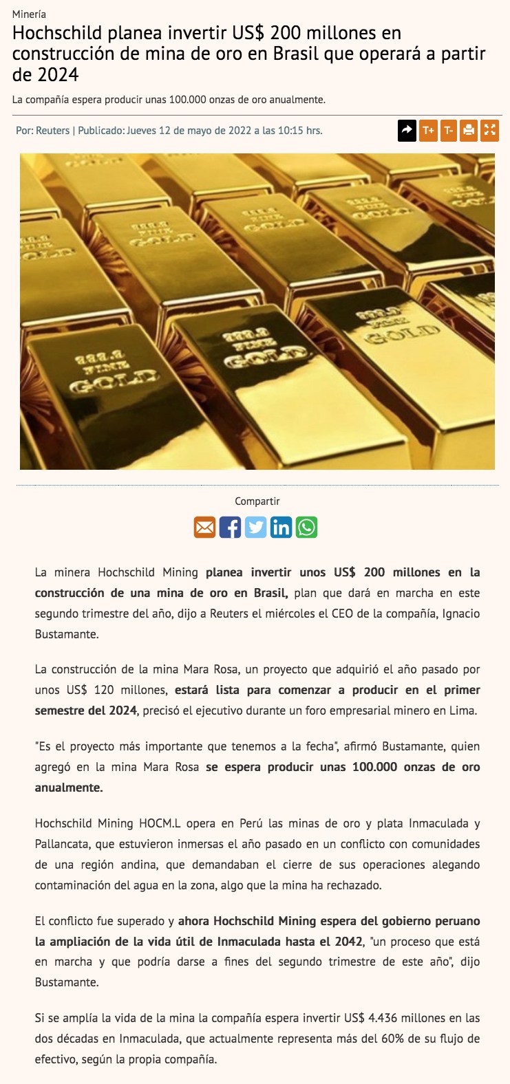Hochschild invertirá US$ 200 millones en la construcción de una mina de oro en Brasil - (americaeconomia online)