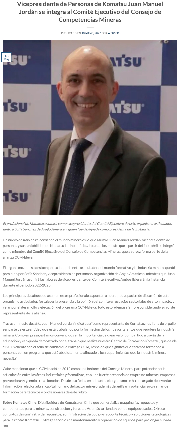 Vicepresidente de Personas de Komatsu Juan Manuel Jordán se integra al Comité Ejecutivo del Consejo de Competencias Mineras - (portalminero)