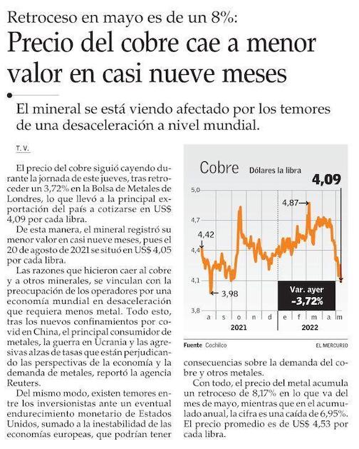 Cobre pierde más de 15% desde su peak y queda cerca de los US$4 - (Pulso)