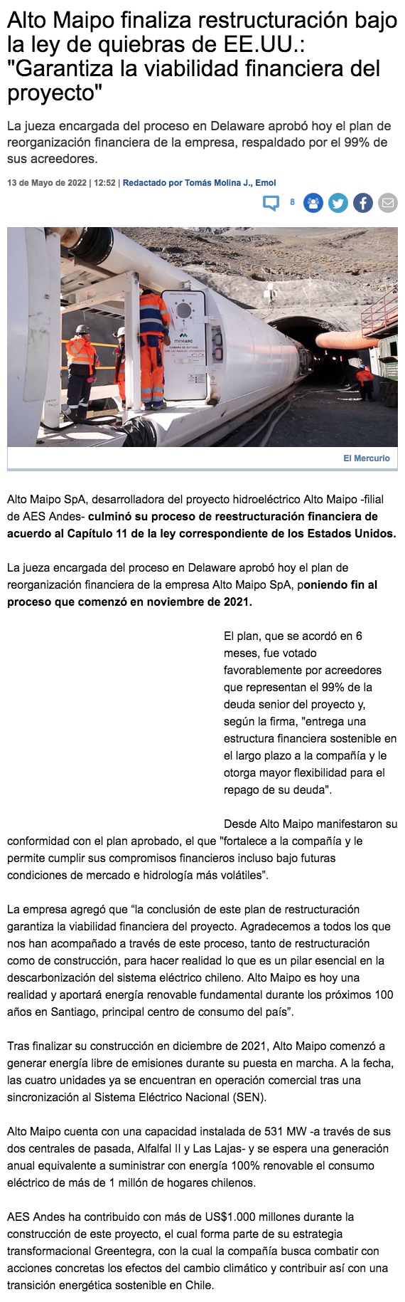 Alto Maipo sale de la Ley de Quiebras en EE.UU. y asegura viabilidad financiera - (Pulso)