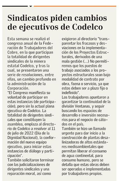 Congreso de la FTC pide nueva plana ejecutiva de Codelco al 11 de julio para retomar el diálogo - (DF Online)