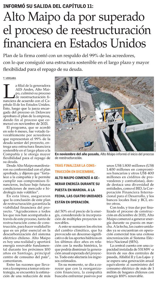Alto Maipo sale de la Ley de Quiebras en EE.UU. y asegura viabilidad financiera - (Pulso)