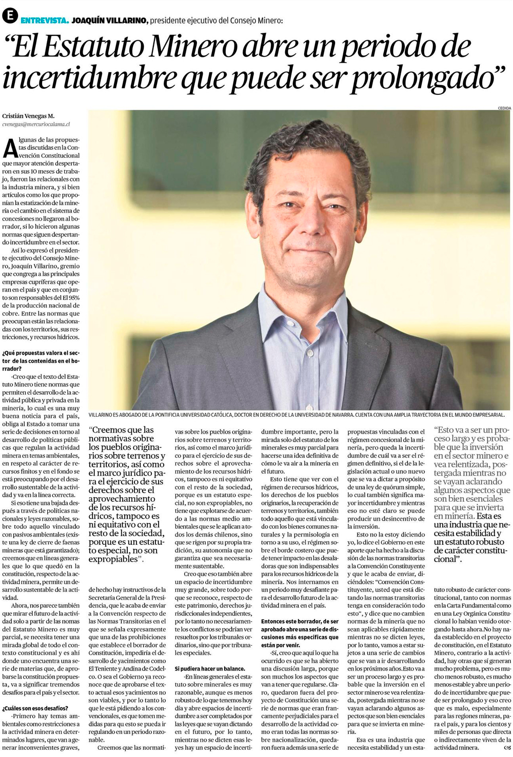 "El Estatuto Minero abre un periodo de incertidumbre que puede ser prolongado" - (El Mercurio de Antofagasta)