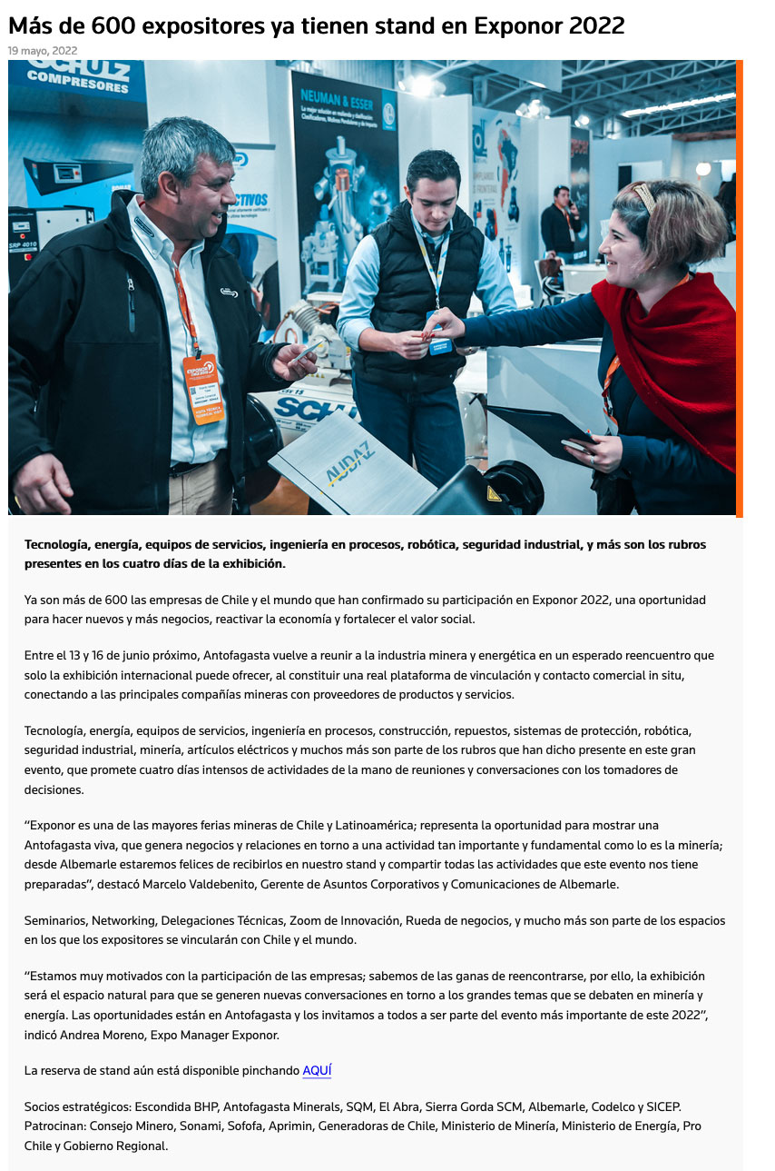 Más de 600 empresas expositoras ya tienen stand en Exponor 2022 - (norteyenergia.cl)