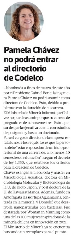 Pamela Chávez acusa discriminación tras su frustrado paso por el directorio de Codelco - (El Mercurio de Santiago)