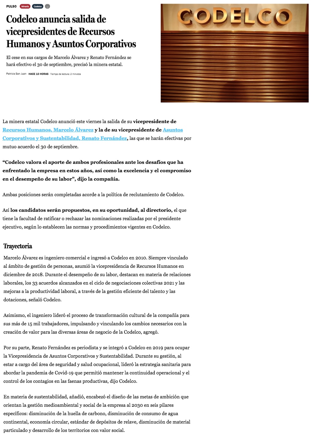 Codelco anunció salida de vicepresidentes de Recursos Humanos y Asuntos Corporativos - (Pulso)