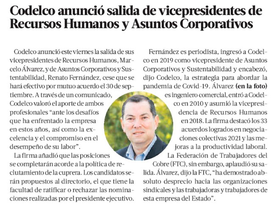 Codelco informa la salida de sus vicepresidentes de Recursos Humanos y Asuntos Corporativos - (DF Online)