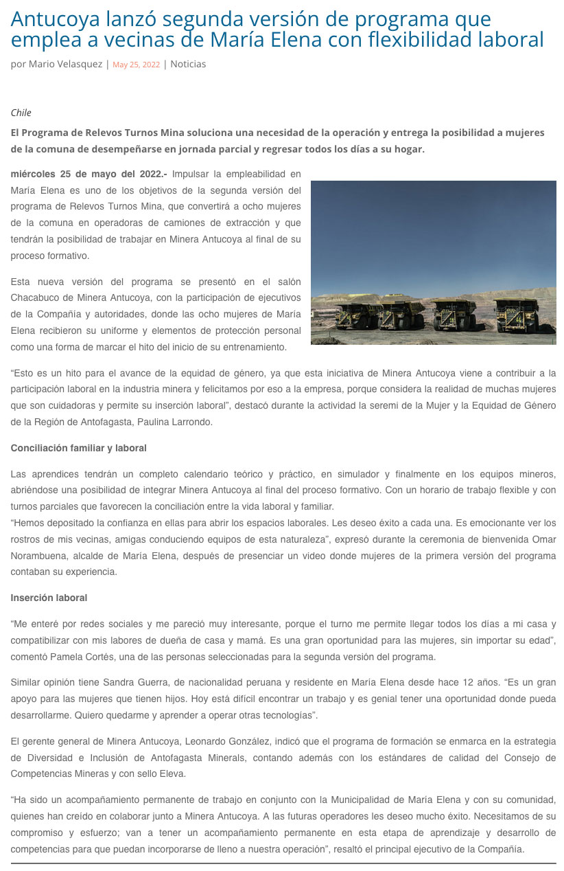 Minera Antucoya lanzó segunda versión de programa que emplea a vecinas de María Elena con flexibilidad laboral - (timeline)