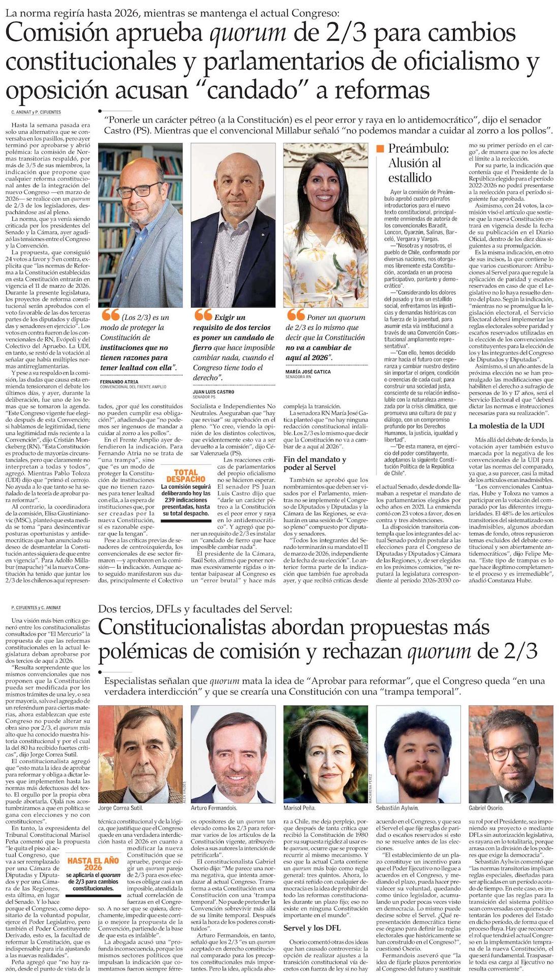 Comisión aprueba que el actual Congreso solo podrá reformar la nueva Constitución con quórum de 2/3 - (La Tercera)