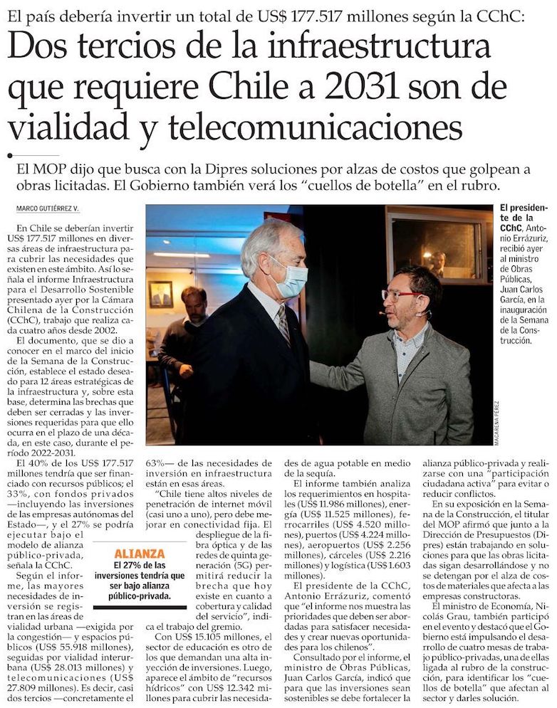 CChC eleva la proyección de inversiones para infraestructura entre 2022 y 2031 a US$ 177.500 millones - (Diario Financiero)