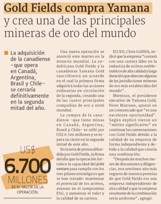 Minera Gold Fields adquiere Yamana por más de US$ 6.700 millones - (El Mercurio de Santiago)