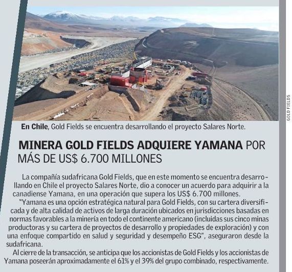 Gold Fields compra Yamana por casi US$ 7 mil millones y crea una de las cuatro principales mineras de oro a nivel mundial - (Diario Financiero)