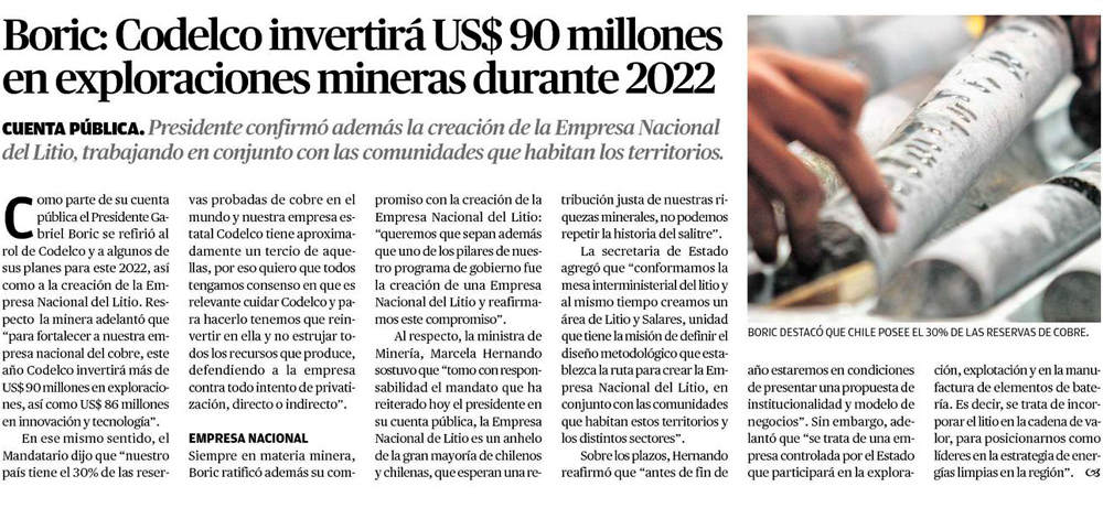 Codelco invertirá más de US$ 90 millones en exploraciones y avanza creación de la Empresa Nacional del Litio - (Diario Financiero)