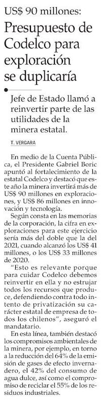 Boric: Codelco invertirá US$ 90 millones en exploraciones mineras durante 2022 - (El Mercurio de Antofagasta)