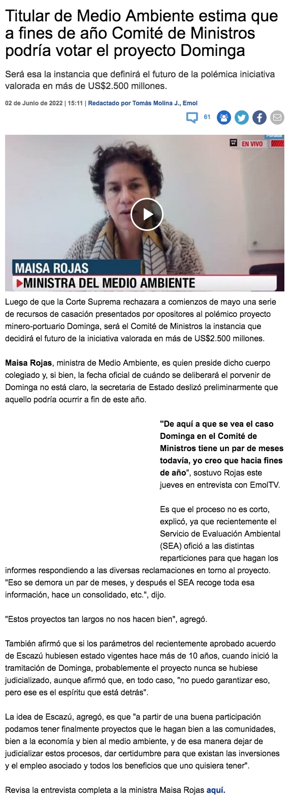 Ministra de Medio Ambiente estima que a fines de año el Comité de Ministros podría evaluar el proyecto Dominga - (La Región)