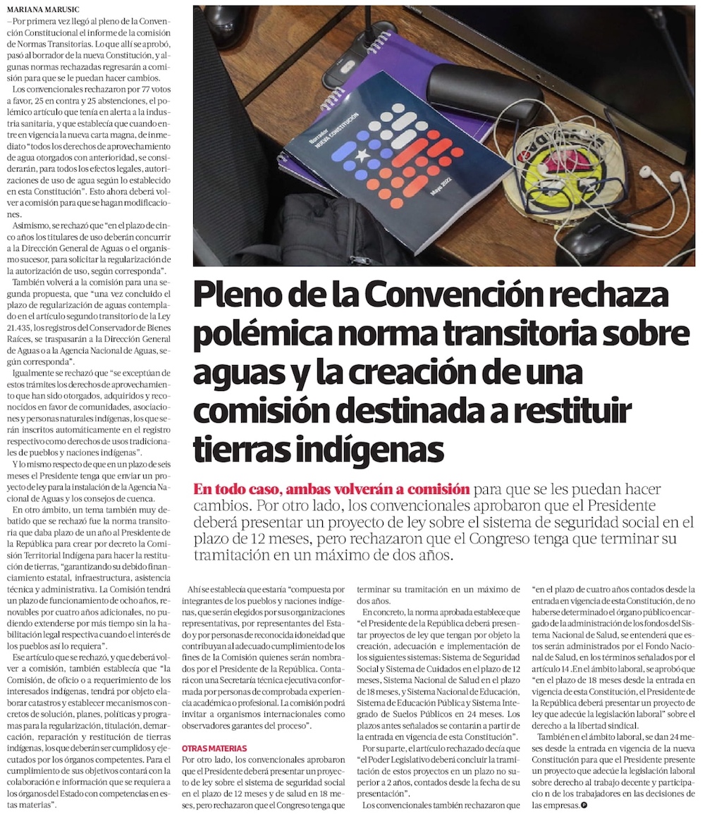 Pleno desecha norma transitoria que caducaba derechos de agua y volverá a comisión para segunda propuesta - (El Mercurio de Santiago)