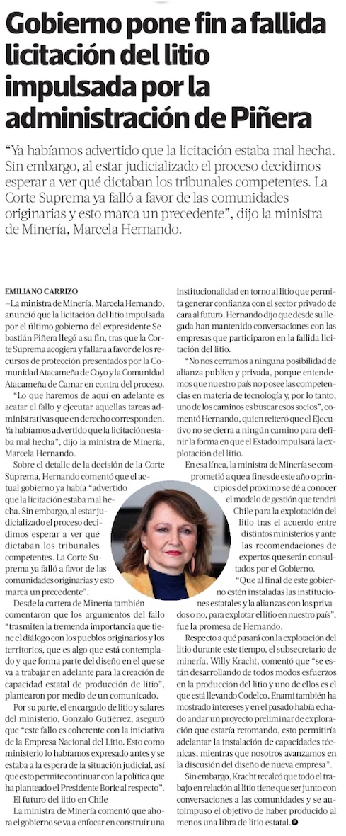 Ministra Hernando sepulta licitación del litio de Piñera y devolverá garantías a empresas - (La Segunda)