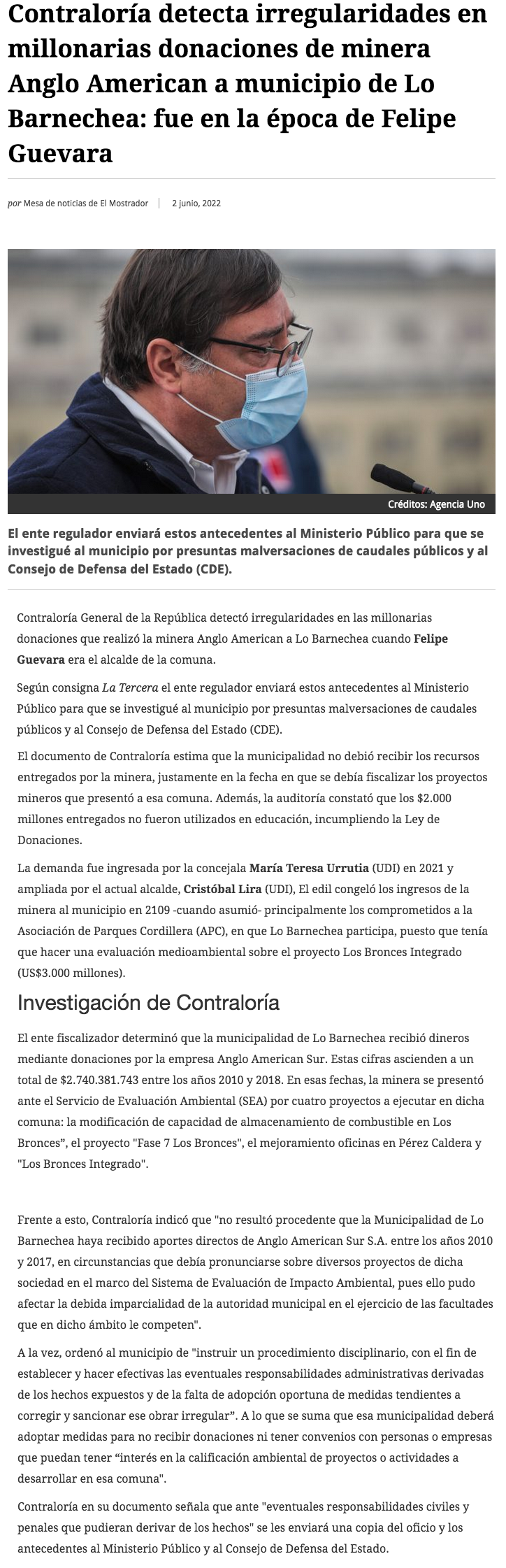 Contraloría envía a Fiscalía antecedentes por millonarias donaciones de AngloAmerican a Lo Barnechea en la era Guevara - (La Tercera)