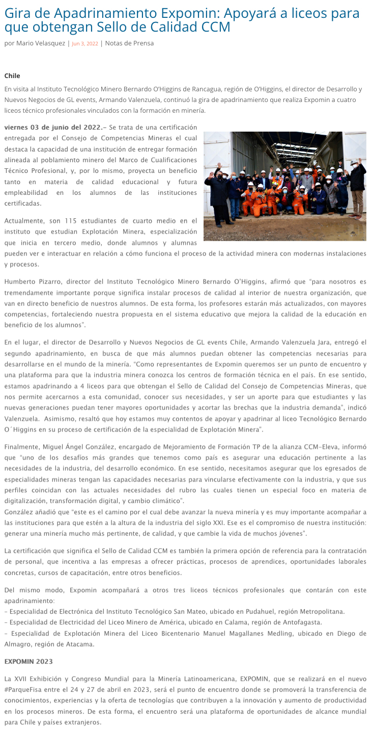 Gira Expomin Apoyará a liceos para que obtengan Sello de Calidad CCM - (nuevaminería online)