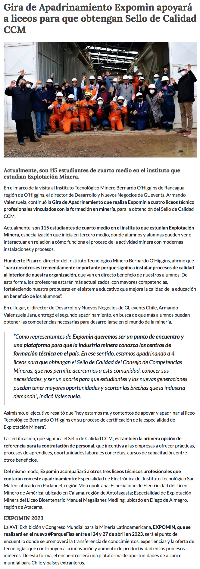 Gira de Apadrinamiento Expomin: Apoyará a liceos para que obtengan Sello de Calidad CCM - (portalminero)