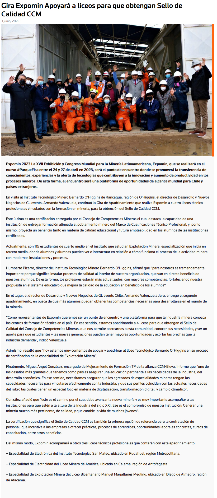 Gira de Apadrinamiento Expomin: Apoyará a liceos para que obtengan Sello de Calidad CCM - (portalminero)