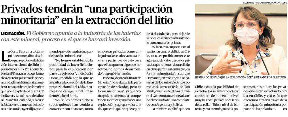 Gobierno aclara que rol de privados en la industria del litio será minoritaria - (Pulso)