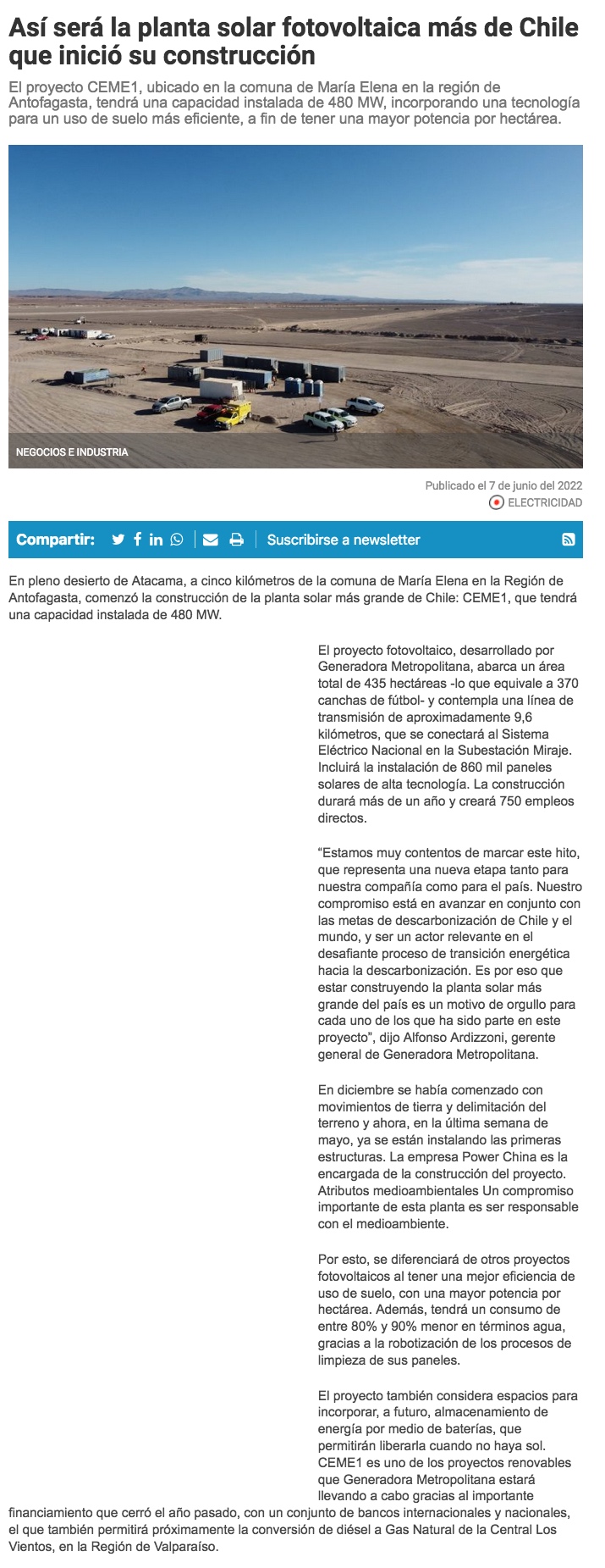 Planta fotovoltaica más grande de Chile inició su construcción en María Elena - (El Mercurio de Calama)