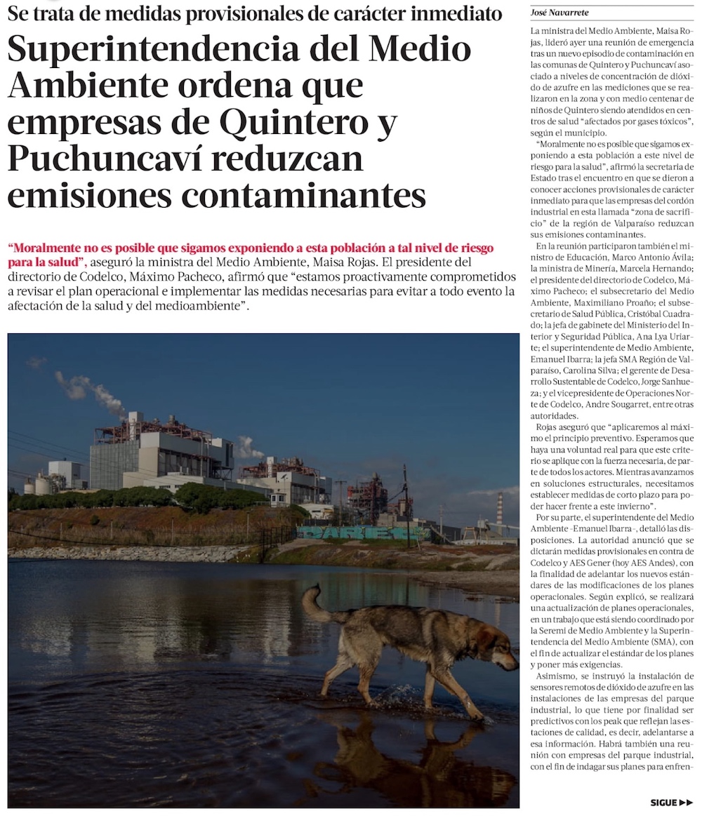 SMA anuncia medidas contra AES y Codelco por evento en Quintero - (El Mercurio de Santiago)