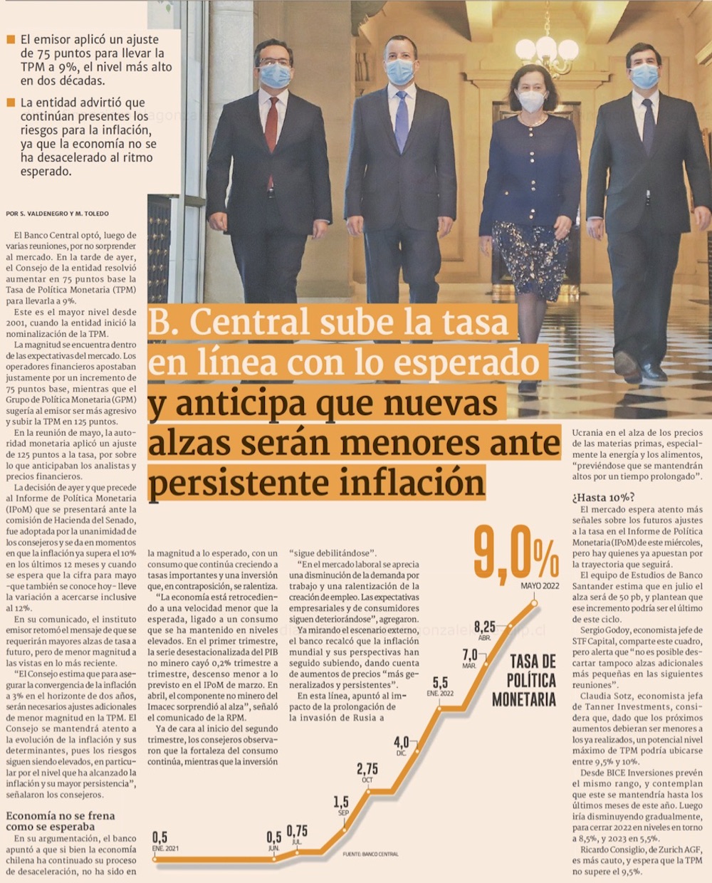 Banco Central sube tasa de interés a 9%, prevé alzas adicionales más acotadas y analistas fijan techo en hasta 10% - (Pulso)