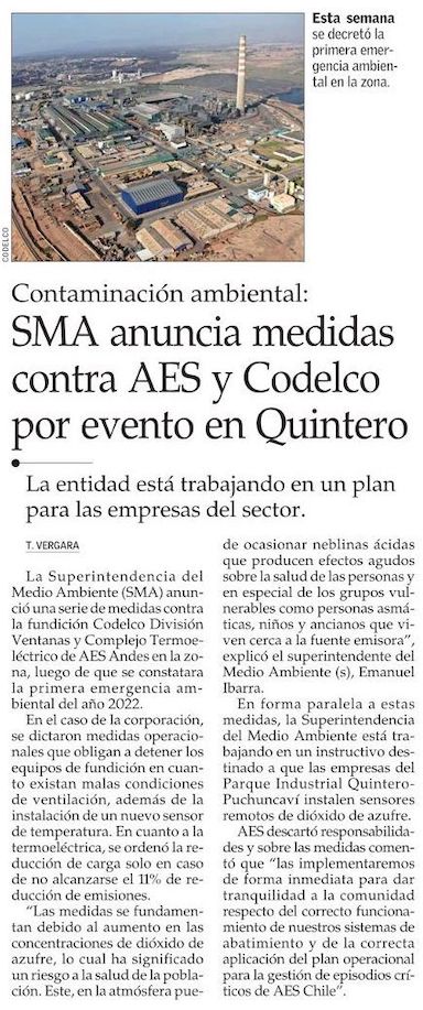 Medio Ambiente pide medidas a Codelco y AES Andes tras contaminación en Quintero - (Diario Financiero)