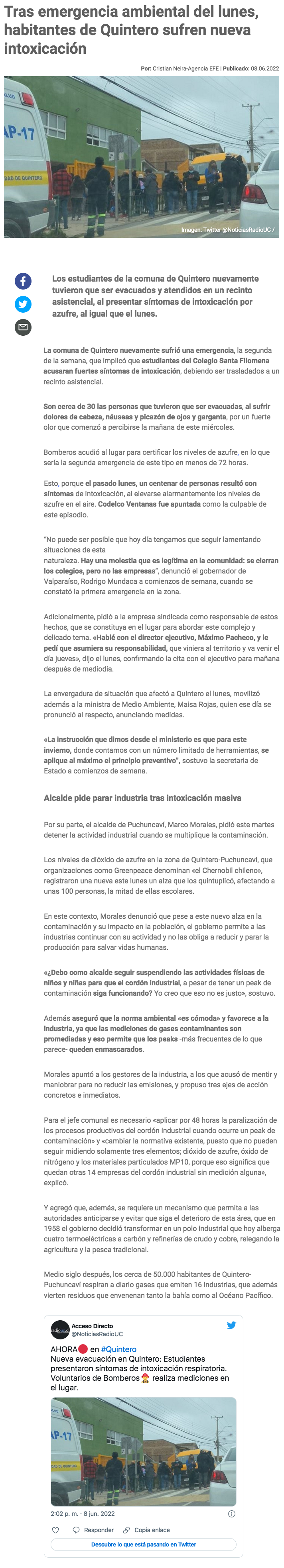 Fiscalía abre investigación por episodios de intoxicación con dióxido de azufre en Quintero Afectaron a más de 75 personas - (La Tercera)