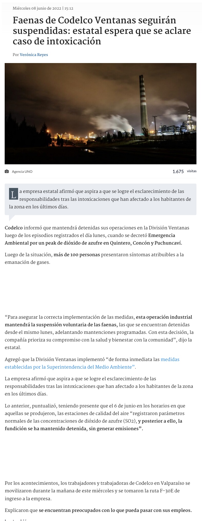 Codelco para su fundición y refinería Ventanas tras episodio de contaminación en zona cercana - (americaeconomia online)