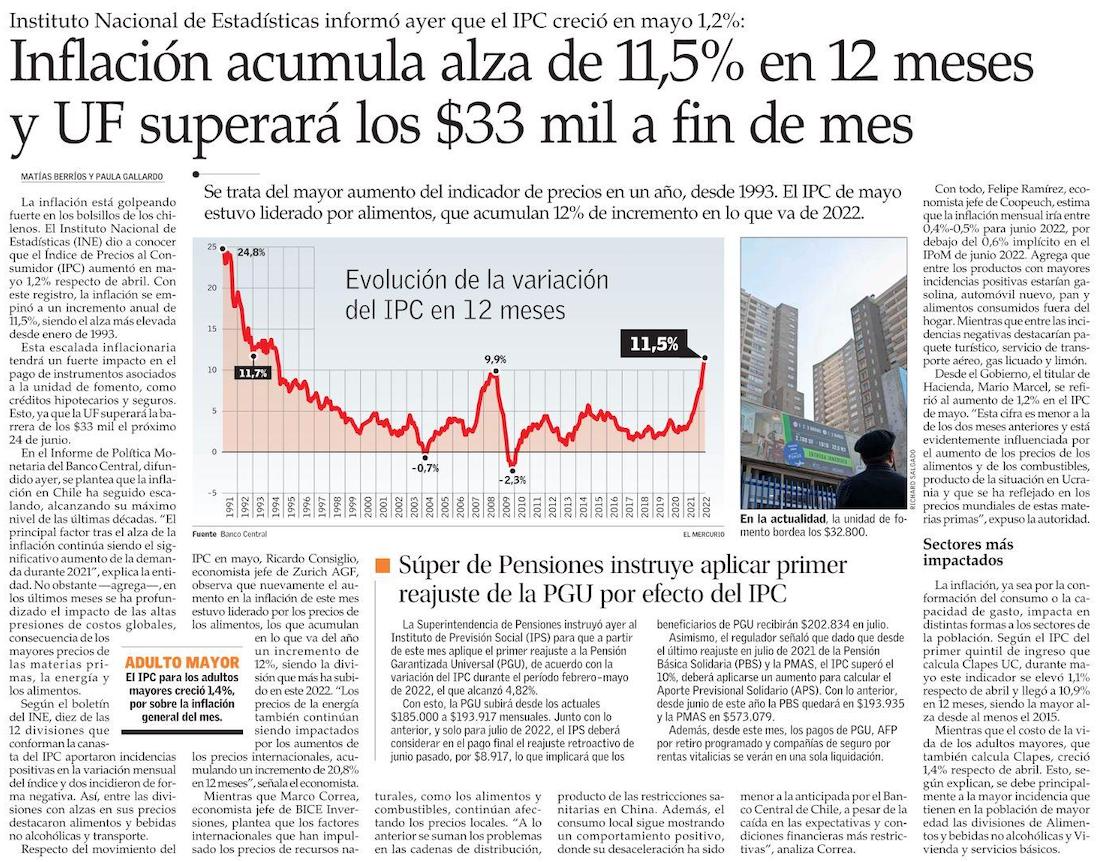 B. Central sube a 10% proyección de inflación este año y expertos ven amenaza de recesión - (El Mercurio de Santiago)