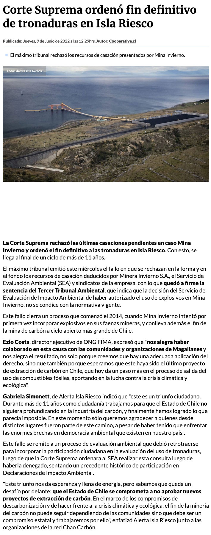 Suprema rechaza recursos por Mina Invierno, ratificando decisión del Tribunal Ambiental - (El Mercurio de Santiago)