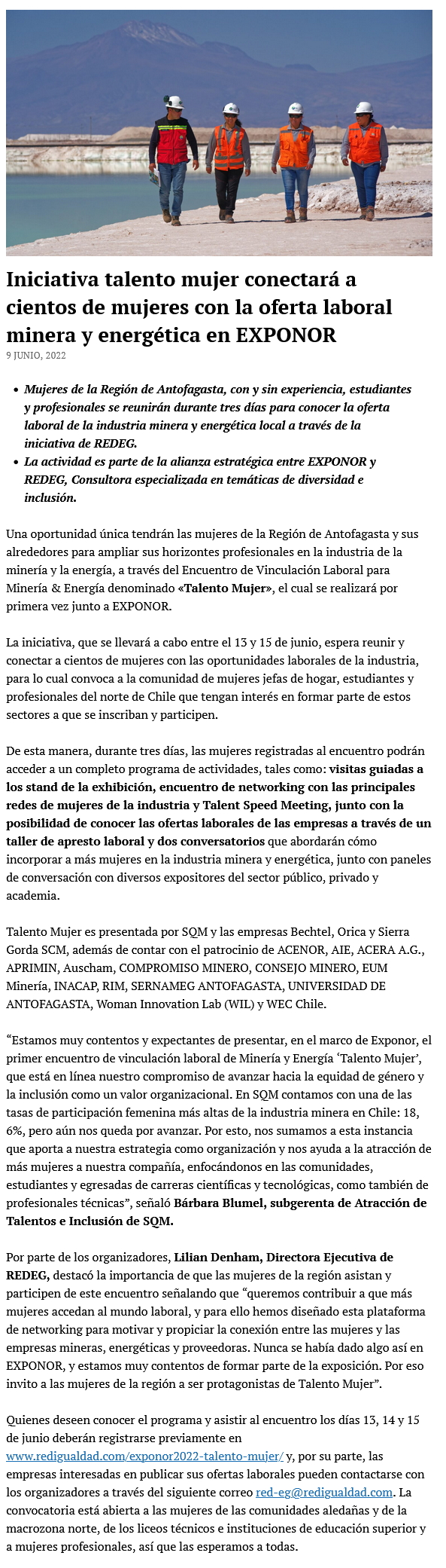 Iniciativa talento mujer conectará a cientos de mujeres con la oferta laboral minera y energética en EXPONOR - (ceinoticias.cl)