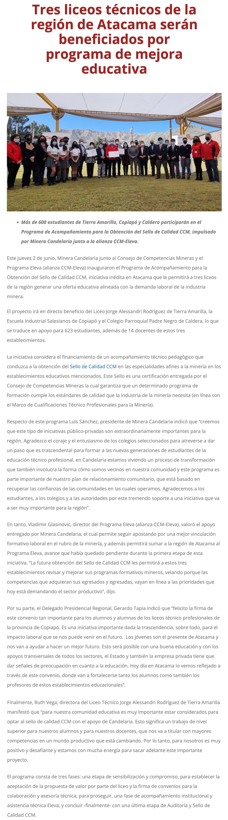 Candelaria: Tres liceos técnicos de la región de Atacama serán beneficiados por programa de mejora educativa gracias a la minera - (Maray Online)