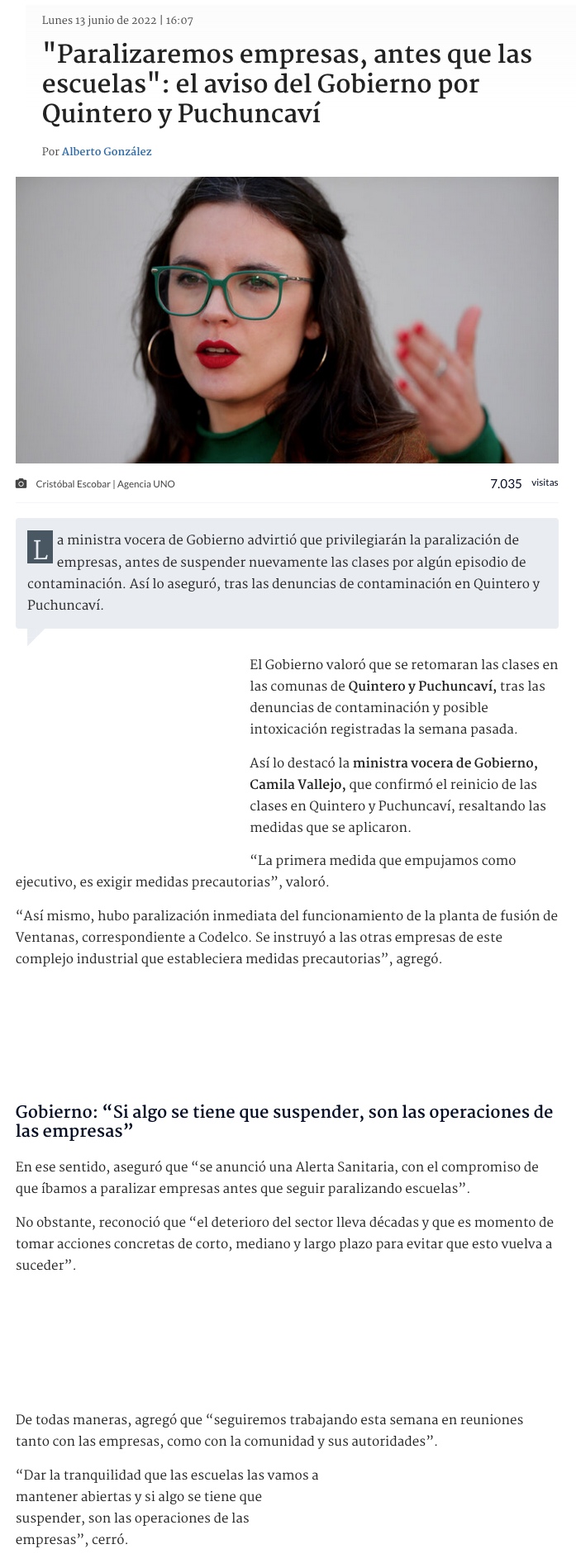 Ministra Vallejo por situación Quintero-Puchuncaví: "Si algo se tiene que suspender son las operaciones de las empresas" - (soyvalparaiso)