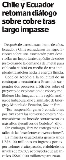 Chile y Ecuador retoman conversaciones por proyecto minero Llurimagua tras un año de negociaciones estancadas - (emol)