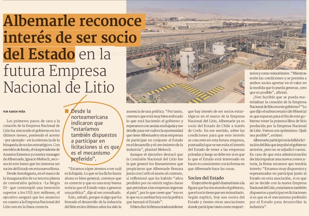 Albemarle revela interés de asociarse con el Estado en Empresa Nacional del Litio - (El Mercurio de Santiago)