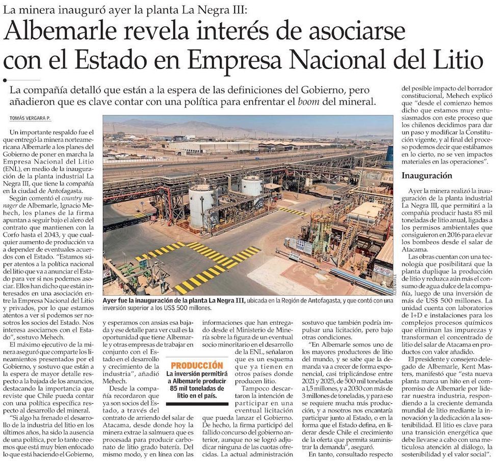 Albemarle inauguró moderna planta de litio en La Negra - (El Mercurio de Antofagasta)