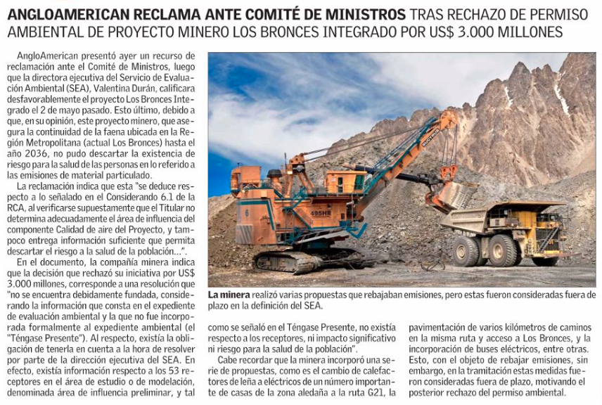 Anglo American recurre al Comité de Ministros para aprobar Los Bronces Integrado - (Diario Financiero)