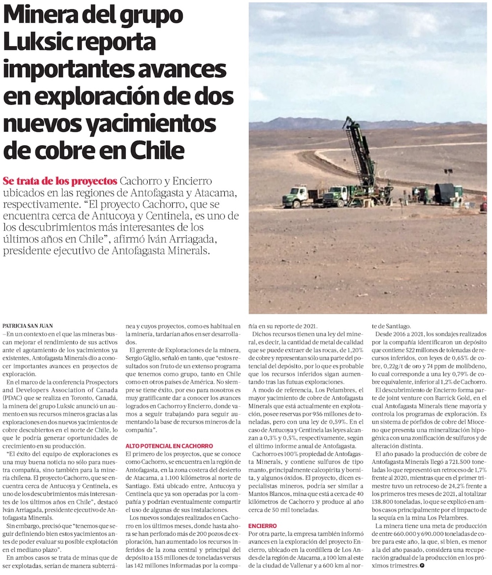 Antofagasta Minerals busca crecer en Chile con dos proyectos nuevos - (El Mercurio de Santiago)