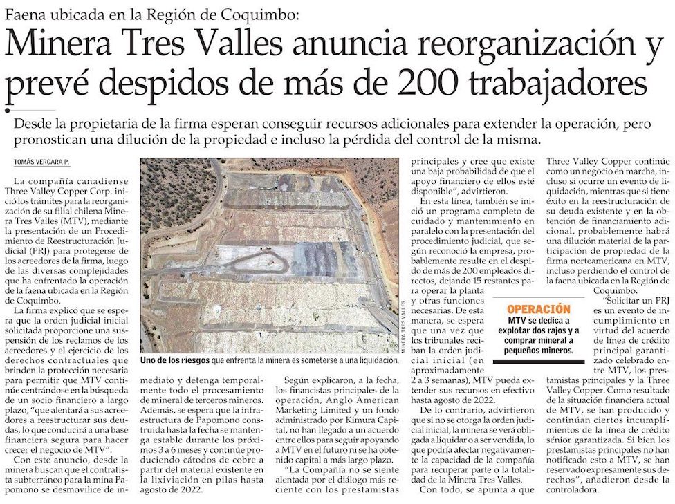 En Mesa Minera de Illapel preocupa efectos de suspensión del poder de compra de Minera Tres Valle - (La Región)