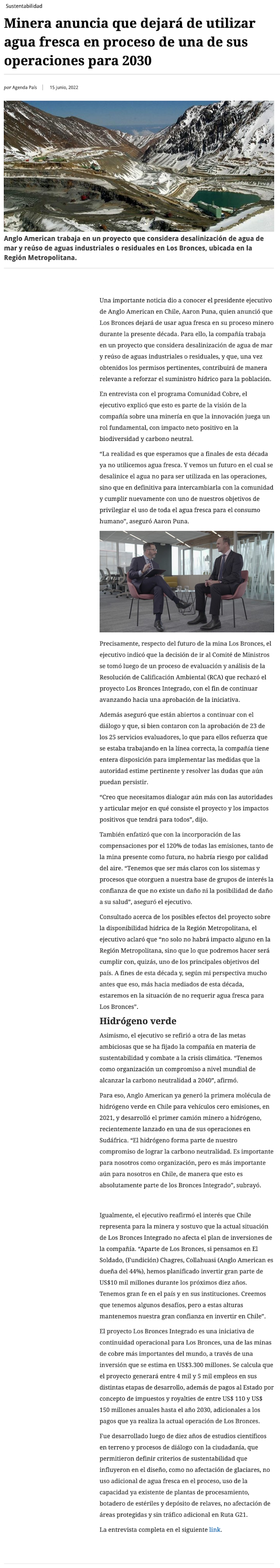 Presidente ejecutivo de AngloAmerican Chile lamenta rechazo a Los Bronces Integrado y estima que la minera dejará de usar "agua fresca" al 2025 - (Pulso)