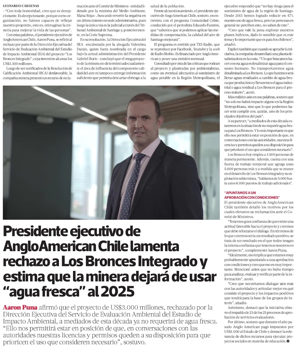 Anglo se pone plazo a 2030 para dejar de usar agua fresca - (El Mercurio de Santiago)