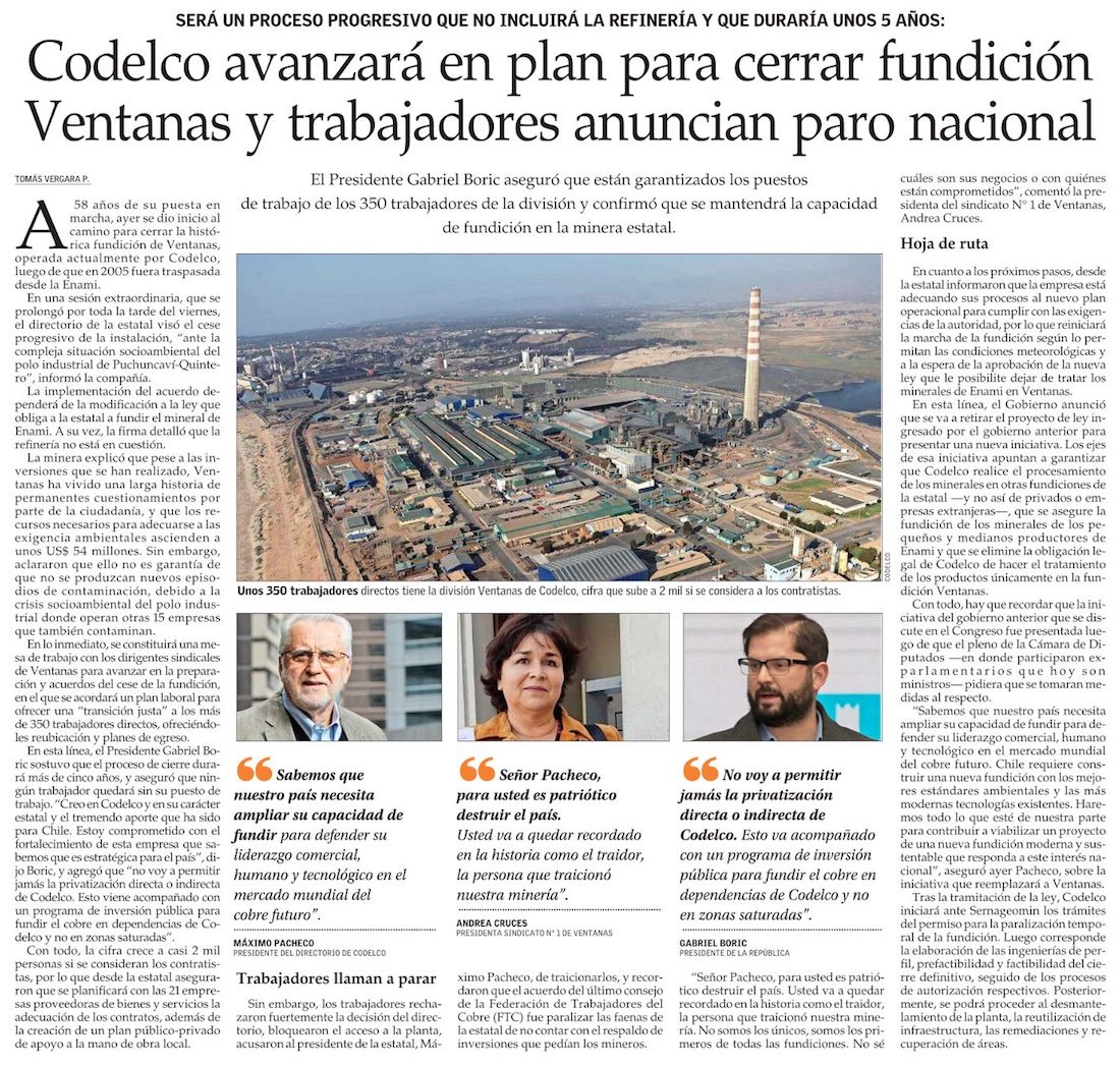 Directorio de Codelco decide cierre progresivo de fundición Ventanas y abre conflicto con trabajadores - (Pulso)