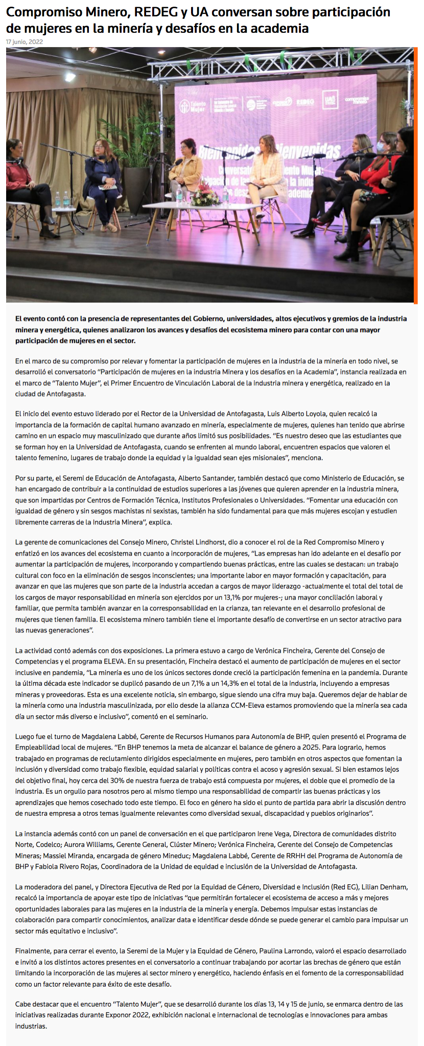 Compromiso Minero, REDEG y Universidad de Antofagasta lideran conversatorio sobre participación de mujeres en minería y desafíos en la academia - (mch.cl)