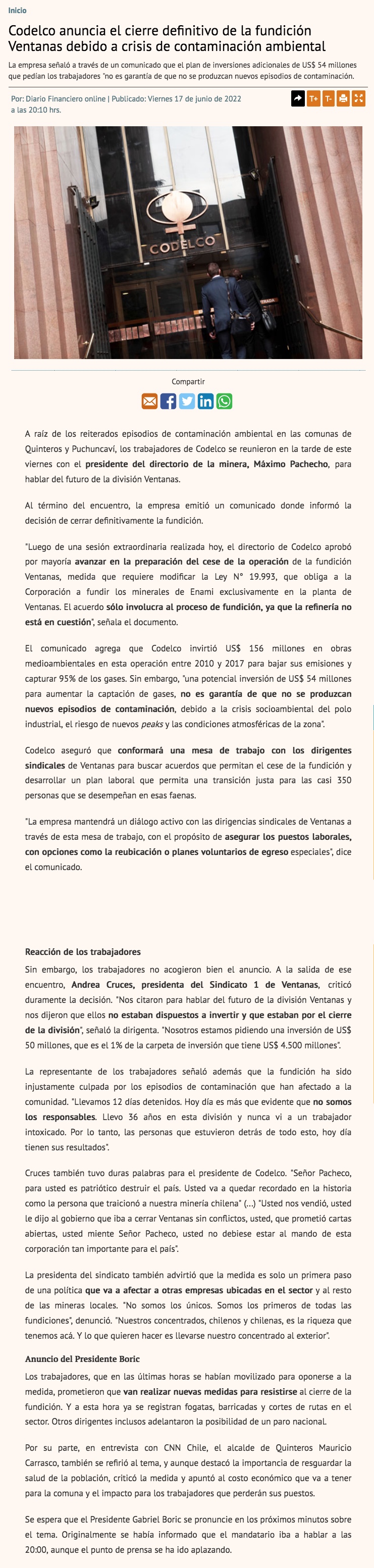 Directorio de Codelco decide cerrar la fundición Ventanas - (El Mercurio de Valparaíso)