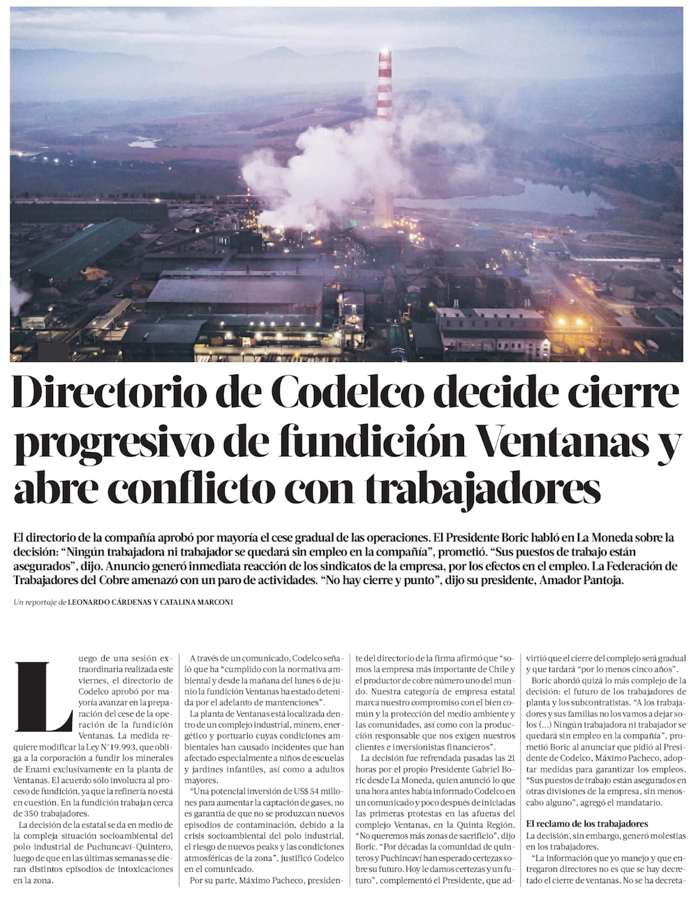Directorio de Codelco decide cerrar la fundición Ventanas - (El Mercurio de Valparaíso)
